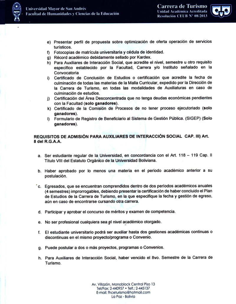 La Carrera de Turismo sobre la base del Estatuto Orgánico da la Universidad Boliviana, el Reglamento General de Auxiliares Academ0os de la UMSA aprobado con Resolución H.C.U. No. 251/2021; Complementado y Enmendado mediante Resoluciones HOU. N° 437 y 623/2021 y la Resolución Rectoral N° 897/2021. Invita a los señores estudiantes de la Carrera de Turismo, a participar del Concurso de Mitos y Examen de Competencia para el cargo de "Auxiliar. de Interacción Social, para proyectos/programas o convenio.