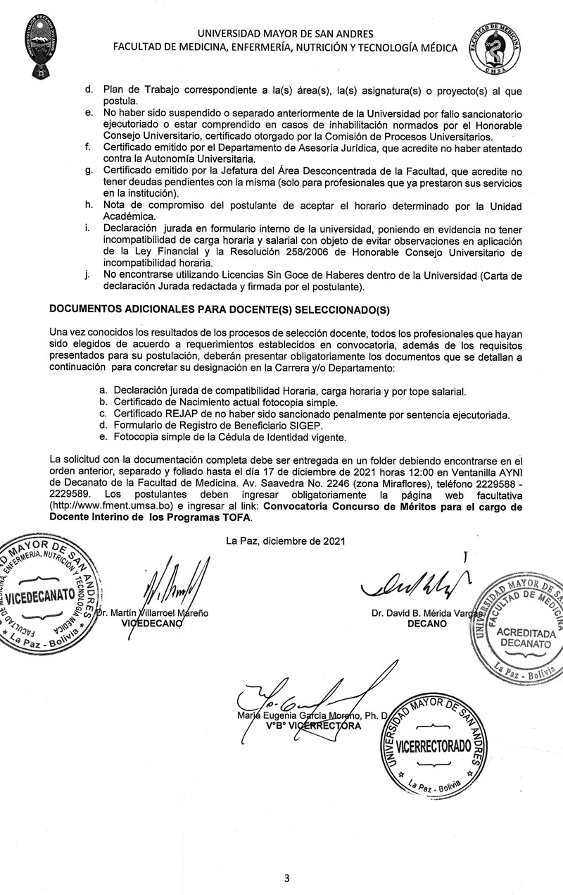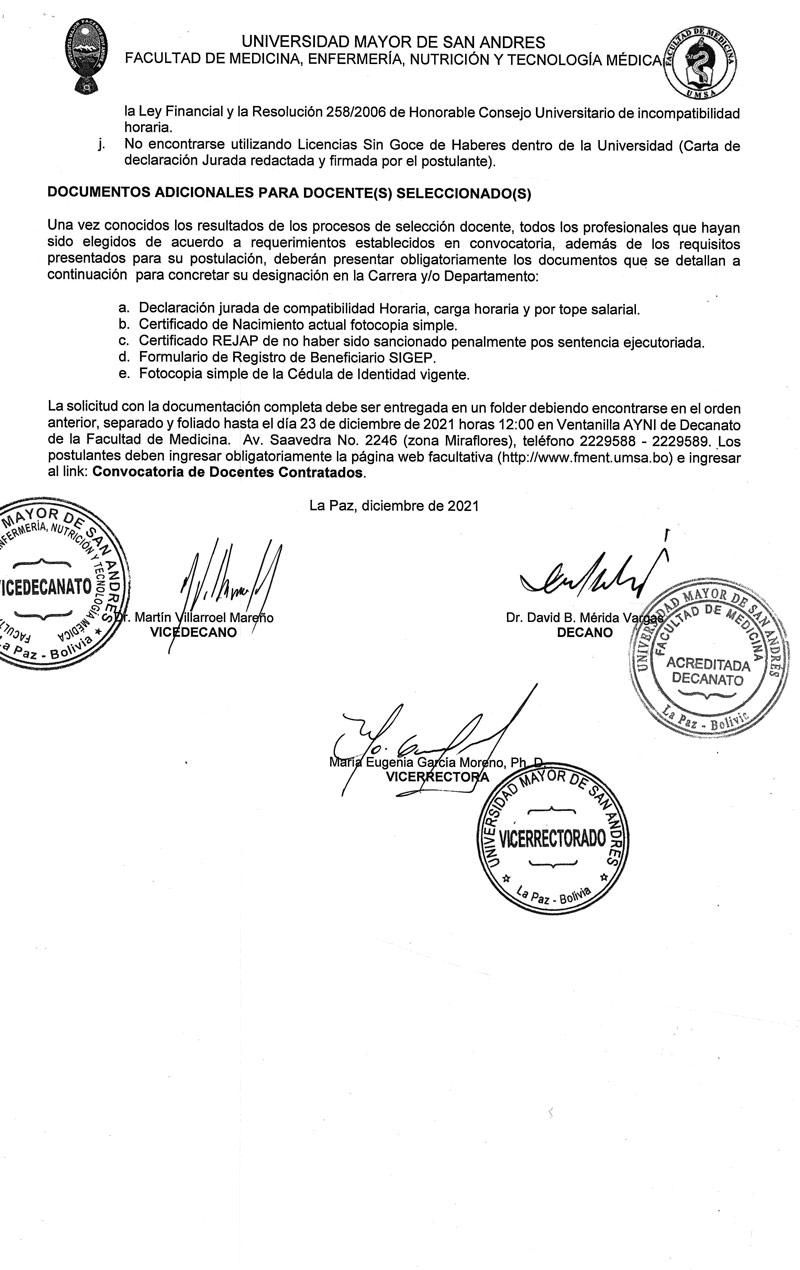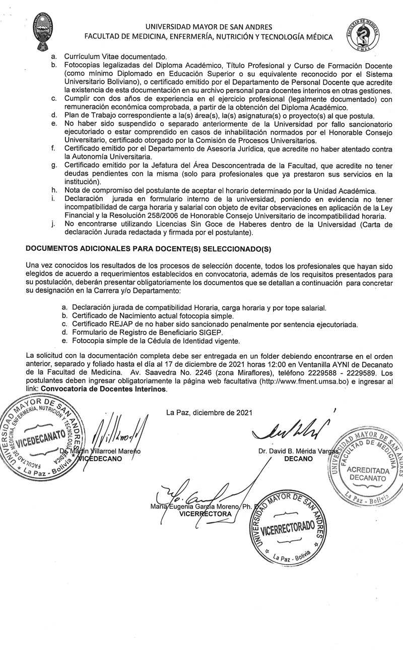 La Facultad de Medicina, Enfermería, Nutrición y Tecnología Médica sobre la base del Estatuto Orgánico de la Universidad Boliviana, Congreso Nacional de Universidades, Reglamento para la Elaboración de Convocatorias Académicas de Docentes Contratados e Interinos, la Resolución del Honorable Consejo Facultativo N° 0811/2021 invita a los señores profesionales nacionales o extranjeros con conocimiento y experiencia en la(s) asignatura(s) o área(s) a las que postula y que cuenten con Diploma Académico y Título Profesional (para extranjeros con residencia legal y documentación convalidada reglamentariamente), a participar del Concurso de Méritos