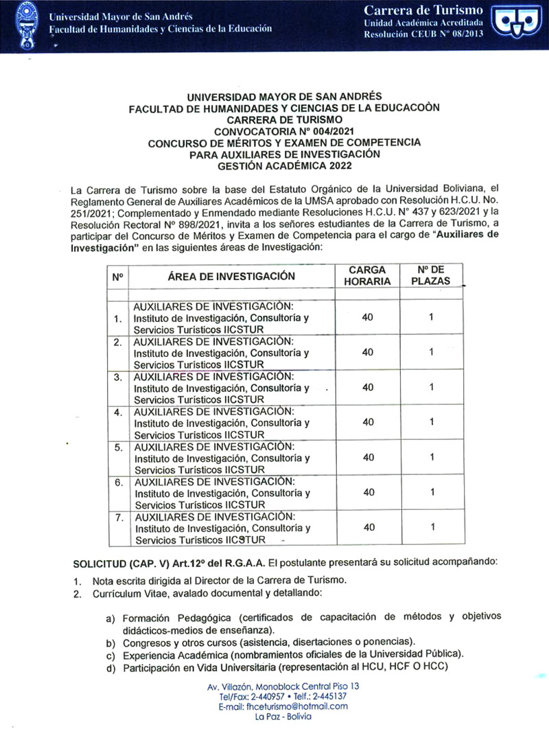 La Carrera de Turismo sobre la base del Estatuto Orgánico de la Universidad Boliviana, el Reglamento General de Auxiliares Académicos de la UMSA aprobado con Resolución H.C.U. No. 251/2021; Complementado y Enmendado mediante Resoluciones H.C.U. N° 437 y 623/2021 y la Resolución Rectoral N° 898/2021, invita a los señores estudiantes de la Carrera de Turismo, a participar del Concurso de Méritos y Examen de Competencia para el cargo de "Auxiliares de Investigación".
