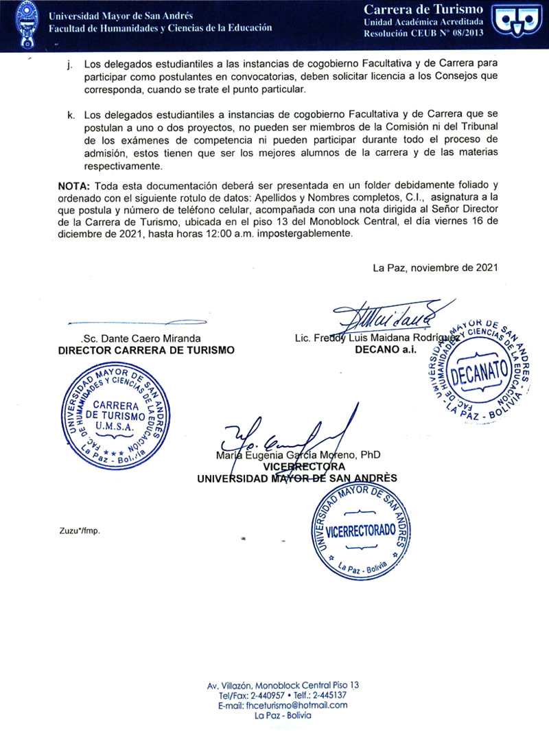CONVOCATORIA PÚBLICA No. 011/2021 CONCURSO DE MERITOS PARA DOCENTES INTERINOS, GESTIÓN 2022 - CARRERA DE TURISMO