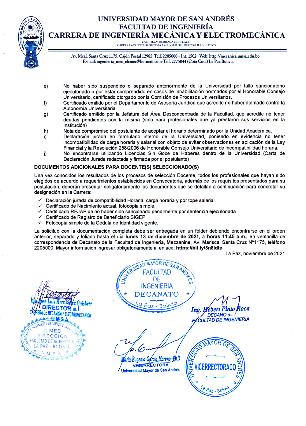 CONVOCATORIA INTERNA N°011/2021 PARA DOCENTES INTERINOS - CARRERA DE INGENIERÍA MECÁNICA Y ELECTROMECÁNICA