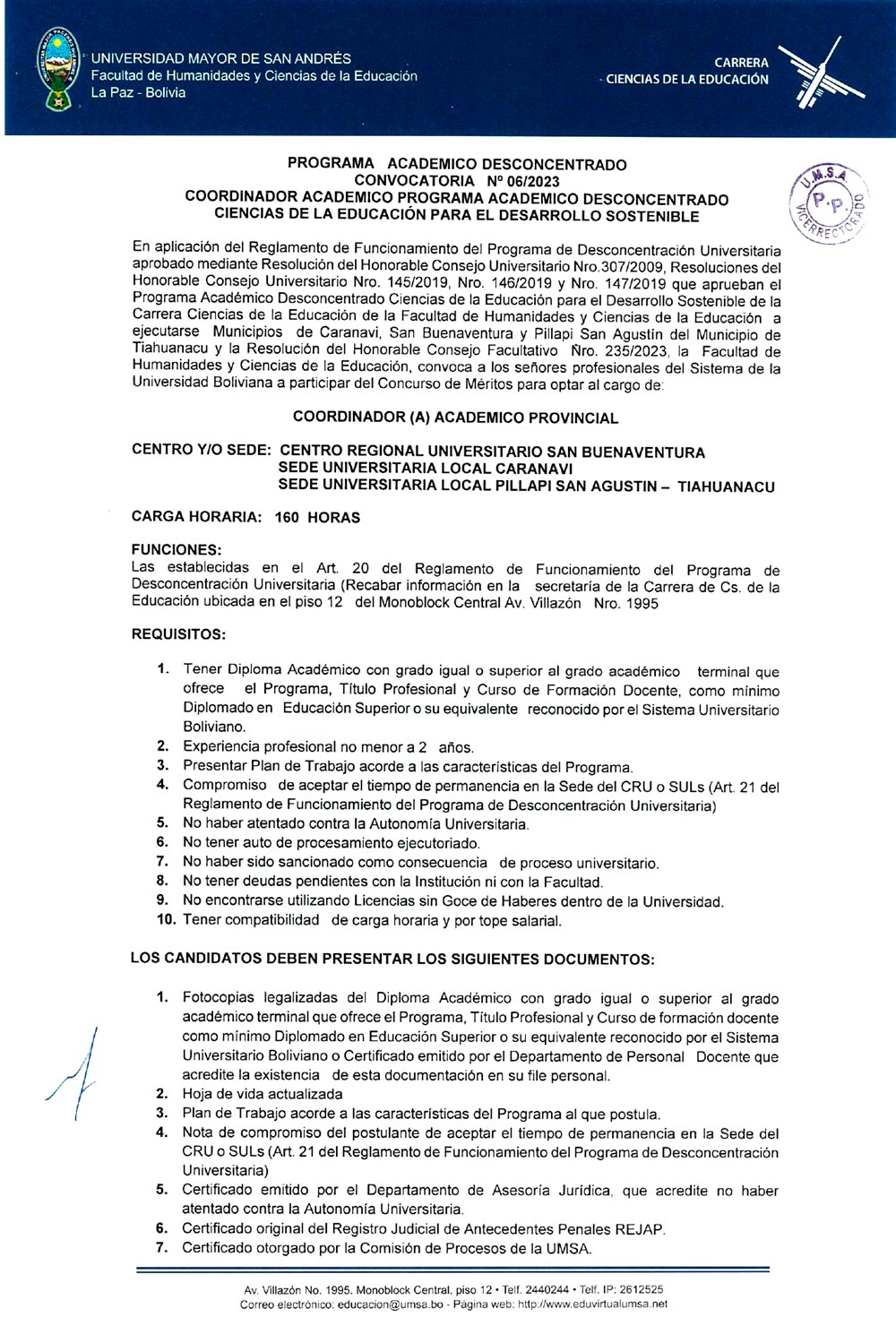 La carrera de Ciencias de la Educación, dependiente de la Facultad de Humanidades y Ciencias de la Educación de la #UMSA, invita a profesionales del Sistema de la Universidad Boliviana, a participar del concurso de méritos para: