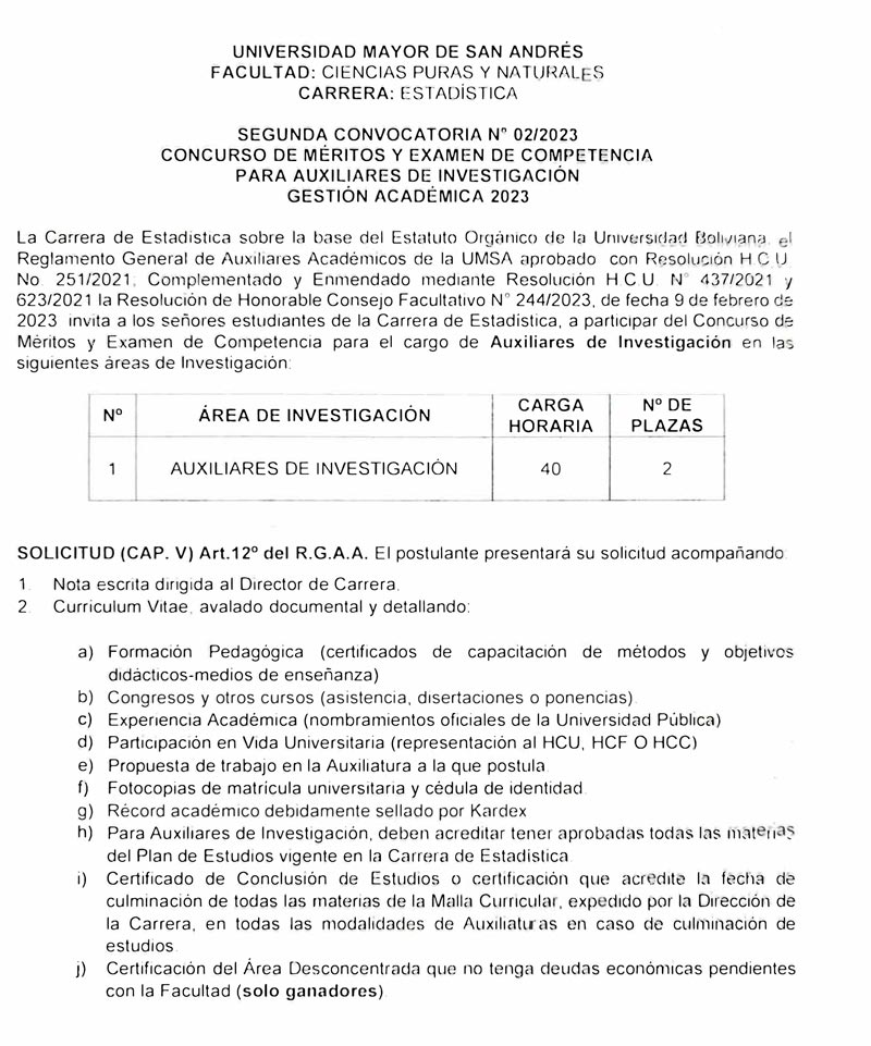 CONVOCATORIA PARA AUXILIARES CARRERA DE ESTADÍSTICA (SEGUNDA CONVOCATORIA – GESTIÓN ACADÉMICA 2023)