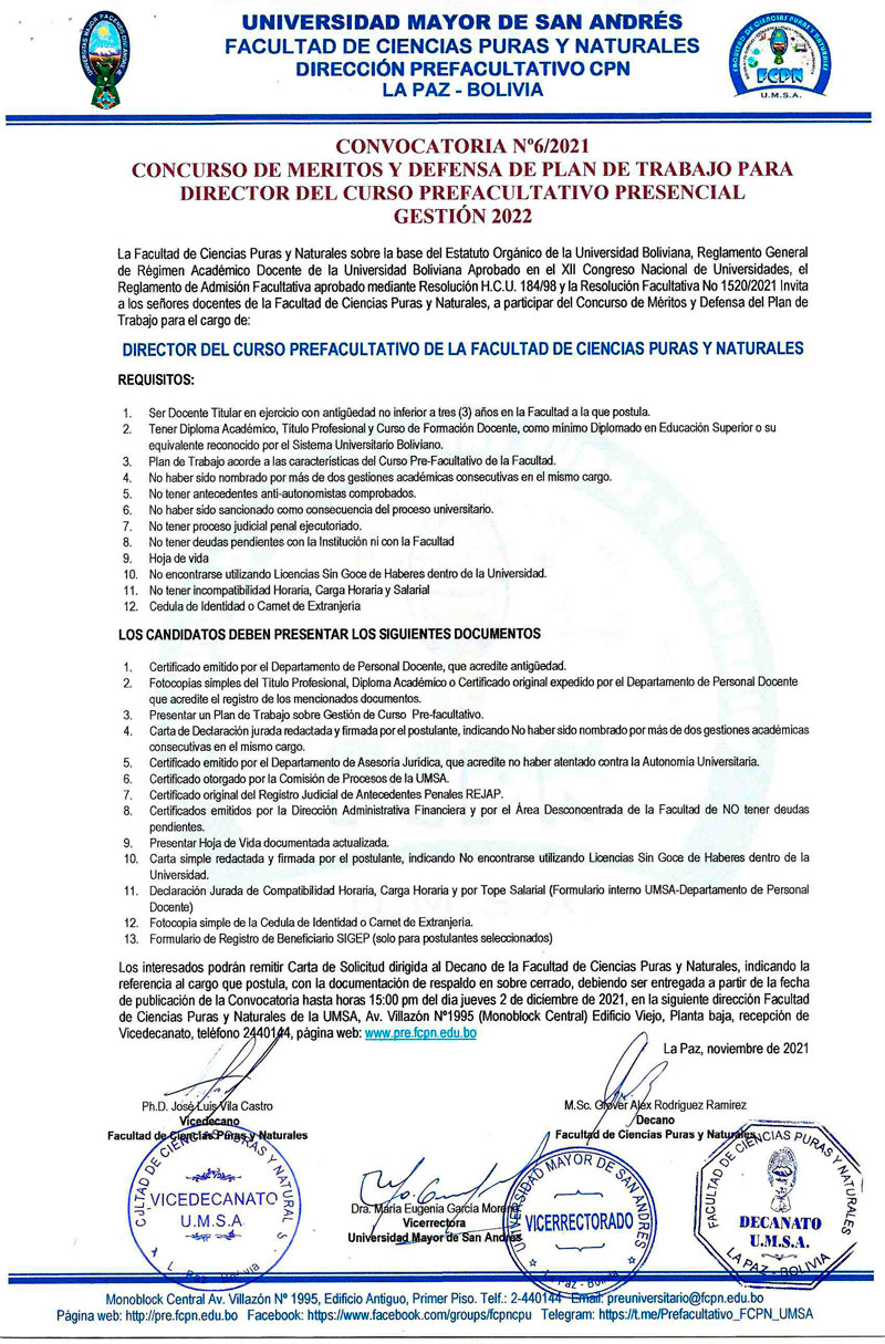 La Facultad de Ciencias Puras y Naturales sobre la base del Estatuto Orgánico de la Universidad Boliviana, Reglamento General de Régimen Académico Docente de la Universidad Boliviana Aprobado en el XII Congreso Nacional de Universidades, el Reglamento de Admisión Facultativa aprobado mediante Resolución H.C.U. 184198 y la Resolución Facultativa No 1520/2021 Invita a los señores docentes de la Facultad de Ciencias Puras y Naturales, a participar del Concurso de Méritos y Defensa del Plan de Trabajo.