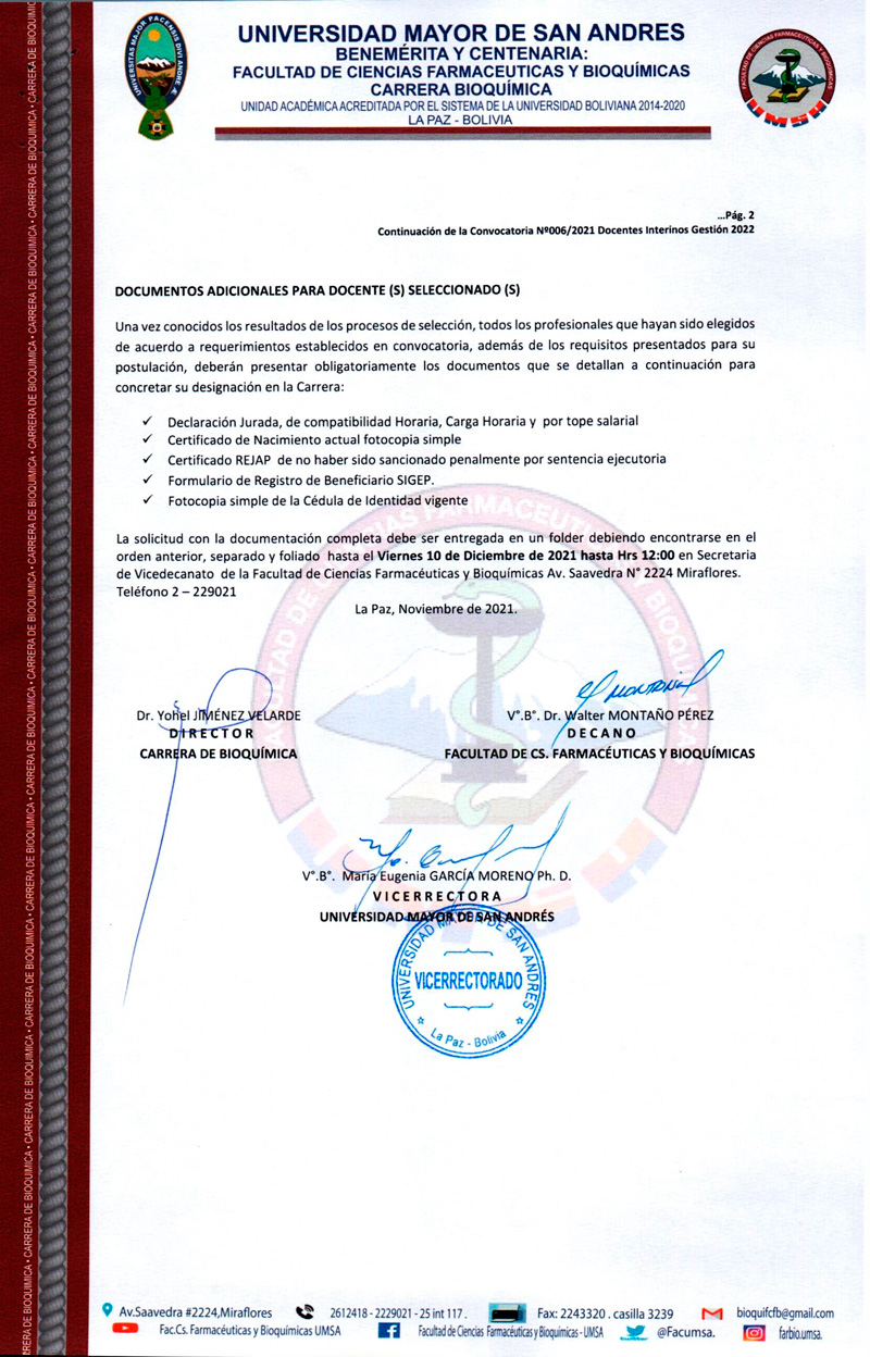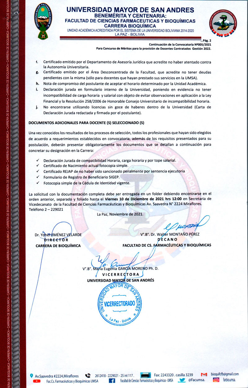 La Facultad de Ciencias Farmacéuticas y Bioquímicas sobre la base del Estatuto Orgánico de la Universidad Boliviana, Congreso Nacional de Universidades, Reglamento para la Elaboración de Convocatorias Académicas de docentes Contratados e Interinos, la Resolución del Honorable Consejo Facultativo N°398/2021 de fecha 05/11/2021 invita a los señores profesionales nacionales o extranjeros con conocimiento y experiencia en la asignatura (s) o área (s) a las que postula y que cuenten con Diploma Académico y Título Profesional (para extranjeros con residencia legal y documentación convalidada reglamentariamente), a participar del Concurso de Méritos.