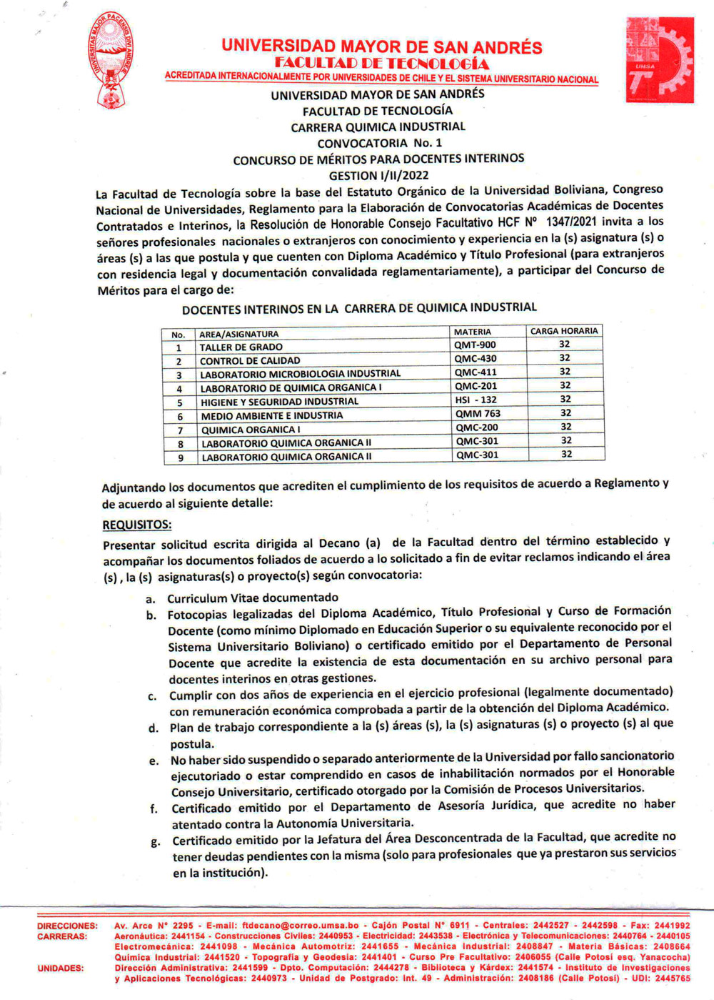 CONVOCATORIA No. 1 - CARRERA QUÍMICA INDUSTRIAL CONCURSO DE MÉRITOS PARA DOCENTES INTERINOS GESTIÓN 2022