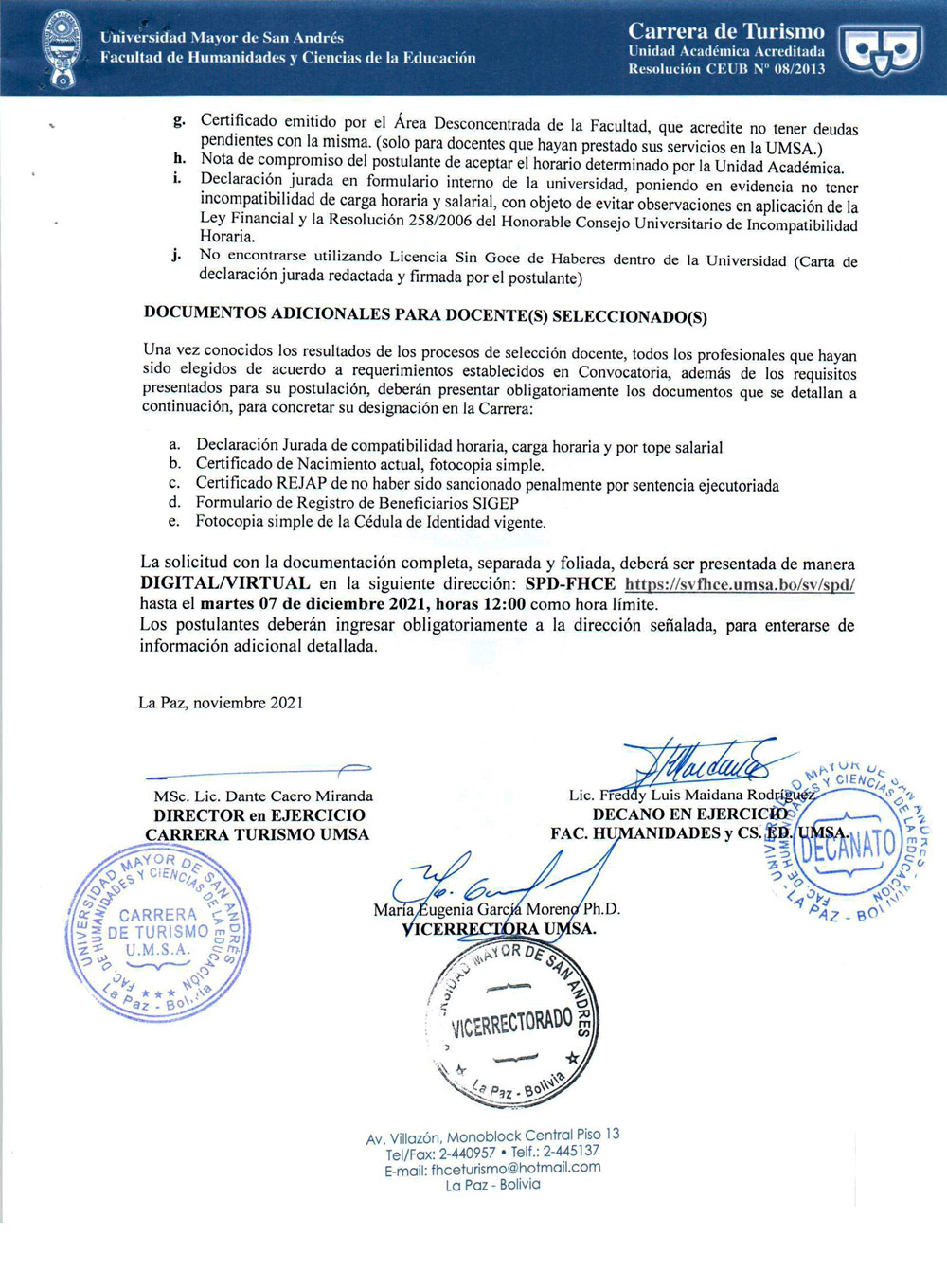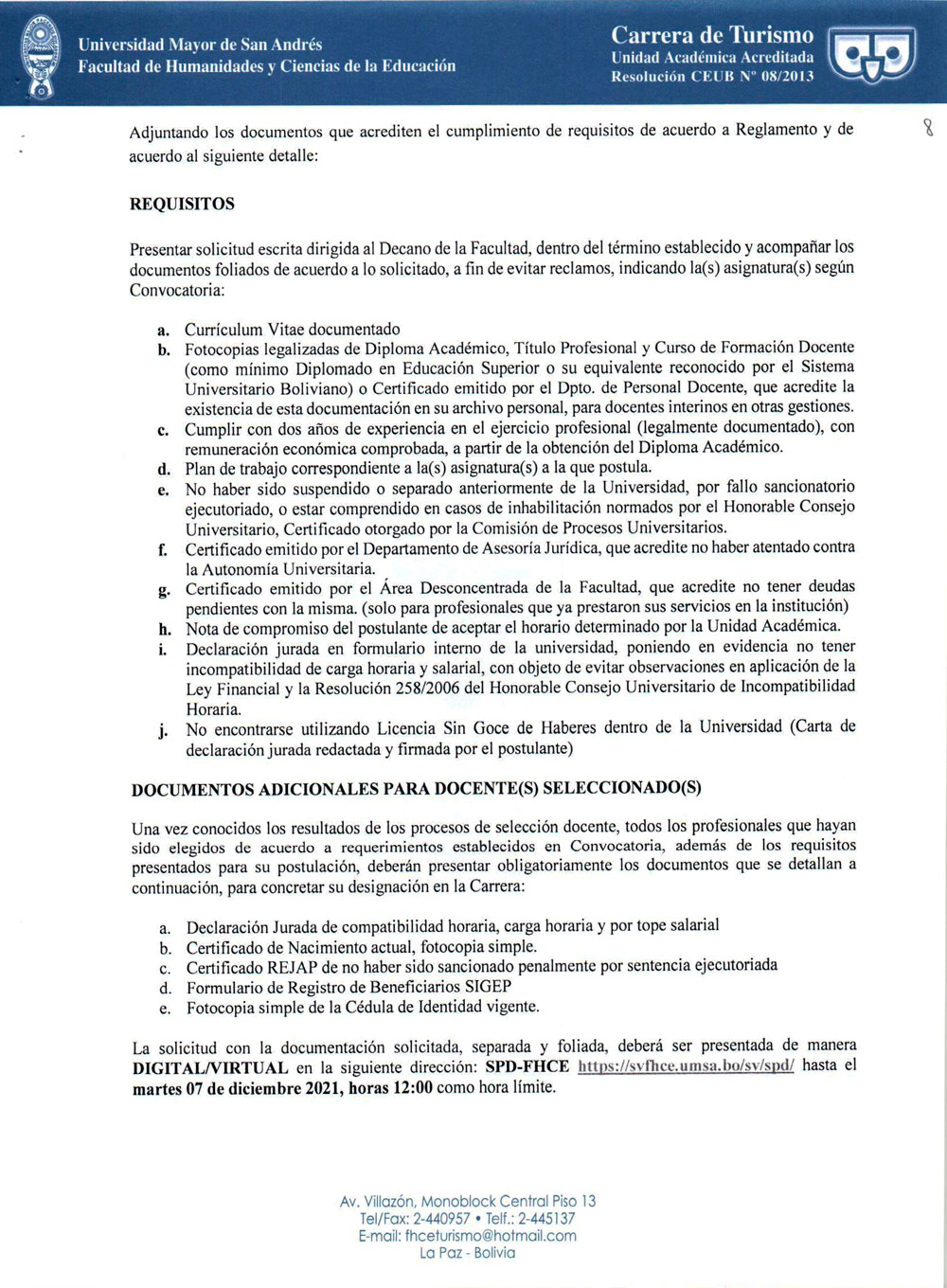 CONVOCATORIA PÚBLICA No. 012/2021 CONCURSO DE MÉRITOS PARA DOCENTES INTERINOS GESTIÓN 2022 - CARRERA DE TURISMO