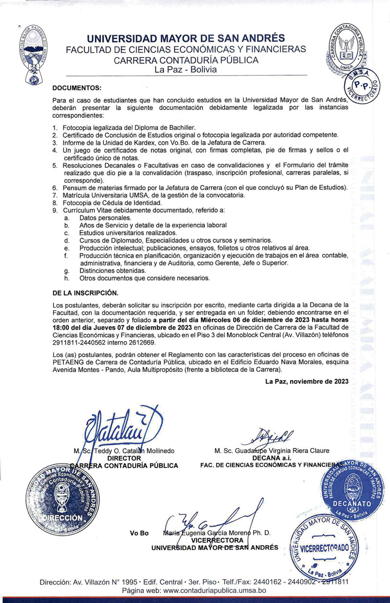 ➡ CONVOCATORIA: La carrera de Contaduría Pública, de la Facultad de Ciencias Económicas y Financieras de la #UMSA invita a los estudiantes que no cumplieron los requisitos de modalidad de graduación en el plazo igual o mayor a tres años a participar del: