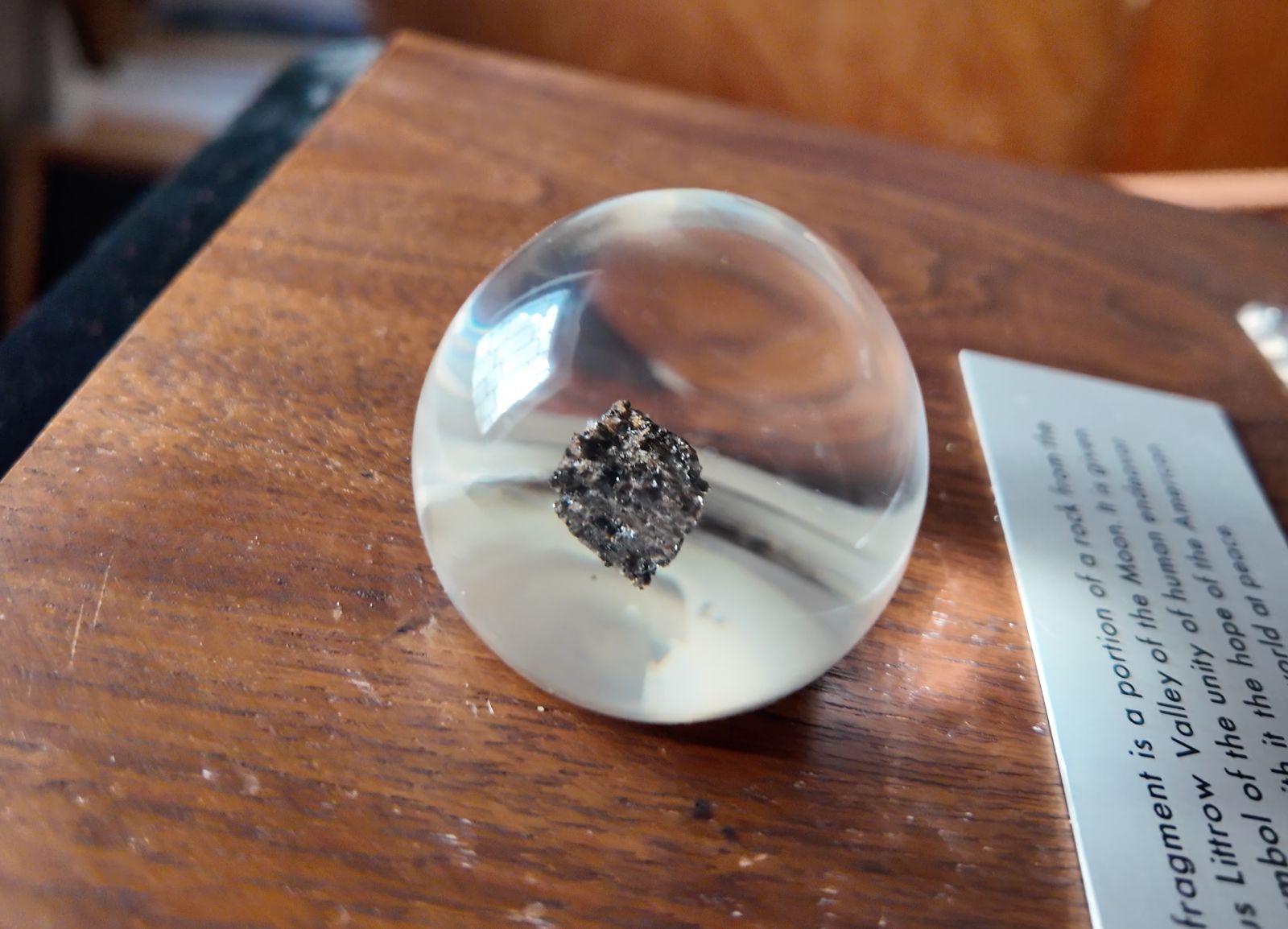 “A cada país le dan su bandera que llegó a la Luna, más un pedacito de la Luna. Es muy pequeñito, pero el que tenemos se lo ve grande porque está encapsulado en un acrílico que, por su geometría, aumenta mucho el tamaño”, explicó Rubbert Muñoz, técnico del Observatorio Astronómico y el Planetario Max Schreier de la UMSA.